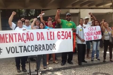 No dia 24/04, Motoristas de ônibus e cobradores demitidos protestam em frente à Secretaria Municipal de Transportes em Botafogo para exigir a regulamentação e cumprimento da Lei 6304 que torna obrigatória a presença de um cobrador no transporte pú