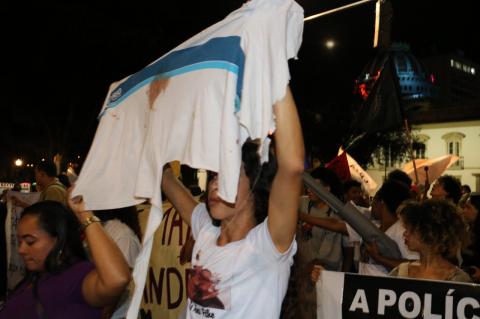 A manifestação contou com a presença da mãe do menino que, segurando seu uniforme escolar manchado de sangue, fez um discurso bastante emocionada.