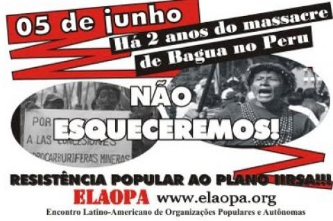 Read moreAs organizações que fazem parte do Encontro Latino Americano de Organizações Populares Autônomas (ELAOPA) firmaram o compromisso de luta continental para o próximo dia 5 de Junho. Esta data é para fazer memória aos dois anos do massacre indígena em Bagua no Peru, num conflito que resultou em dezenas de mortos e simboliza a resistência dos povos latino americanos contra o Plano IIRSA.