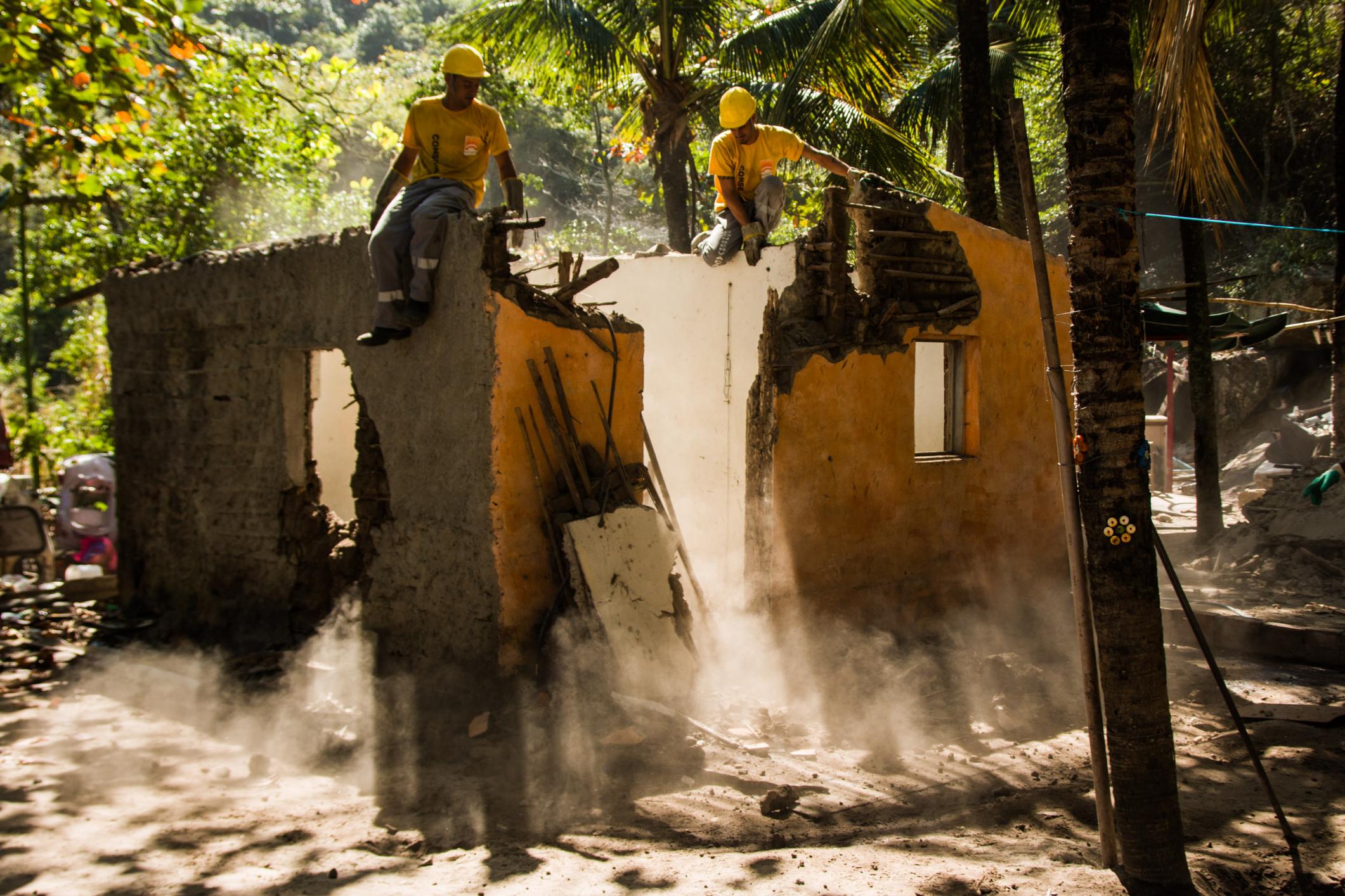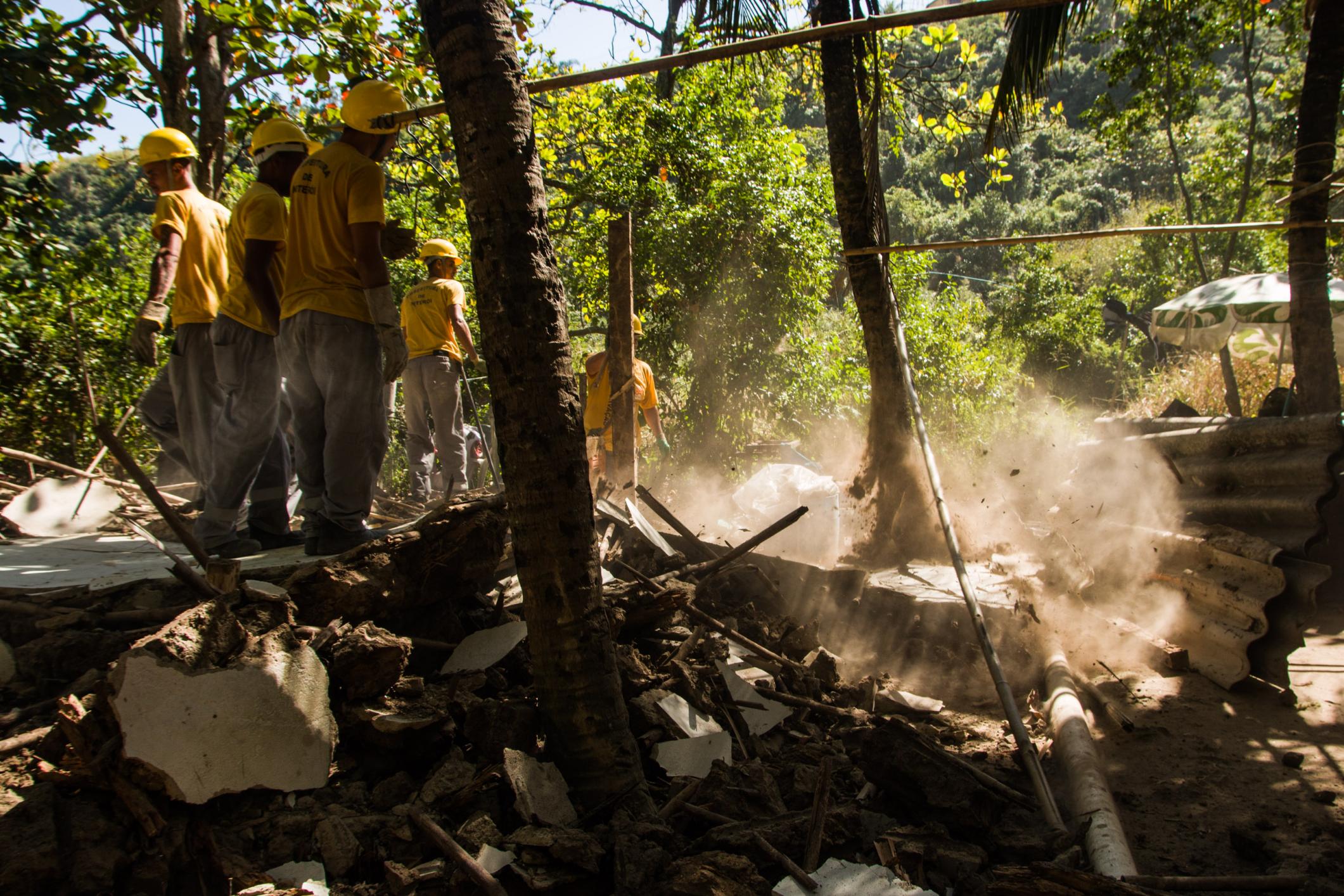 Três oficiais de justiça, funcionários de empresa terceirizada para fazer demolição e uma equipe formada por policias federais, militares e guardas municipais foram mobilizadas para demolir duas das três casas dessas famílias. Segundo os oficiais, a terceira casa não foi demolida por uma questão de “logística” mas que o mandato de despejo foi emitido.