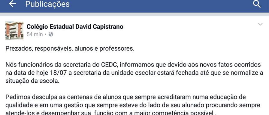 A nota foi apagada pouco tempo depois, mas foi replicada pelo grupo contrário à ocupação chamado “CEDC da depressão”. Uma mensagem de um professor contrário à ocupação também foi postada na página da escola, mas também foi retirada.