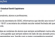 Nesta segunda-feira (18/07), a direção abandonou a escola após os estudantes pedirem a prestação de constas e orientou professores a não darem aulas. Logo em seguida, fizeram uma postagem na página do facebook do colégio justificando a saída devido a “novos fatos” relacionados ao fato de a festa junina ter sido organizada pela ocupação sem o “consentimento da gestão da escola ou do corpo docente da unidade”.