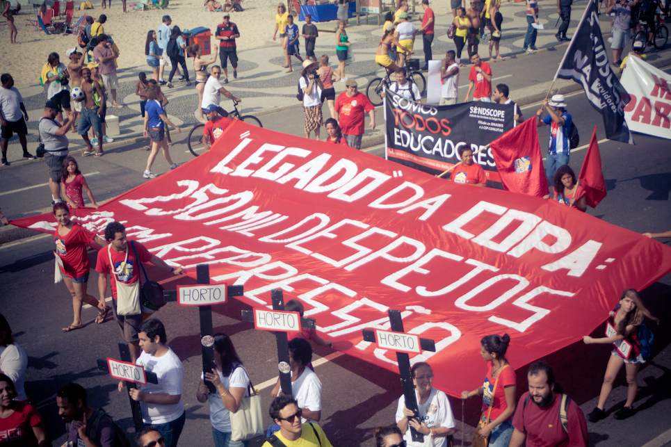 Pouco antes do início do jogo do Brasil, no sábado (28/06), a praia de Copacabana foi tomada por diversos movimentos sociais que participavam do segundo ato “Copa na Rua”. A comissão de frente do “Choque de amor” deu o tom da manifestação que seguiu tranquila do Posto 6 até o Leme, apesar do imenso número de policiais acompanhando a passeata. Próximo ao Copacabana Palace houve uma pausa para leitura coletiva de um manifesto pelo direito à cidade.
