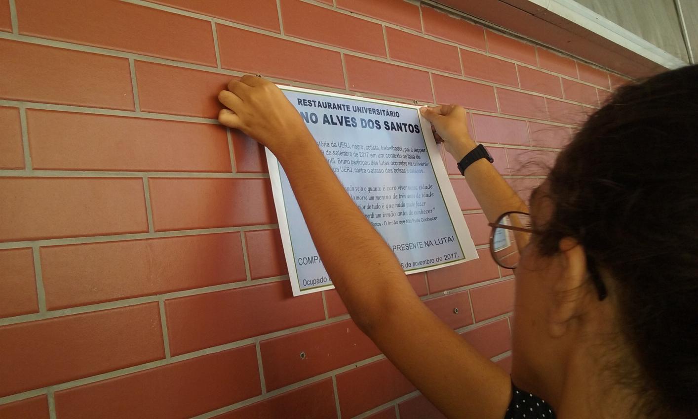 Ainda pela manhã, o ato concentrava-se em frente à fila do bandejão e os estudantes faziam falas homenageando Bruno Alves e sua luta. às 14:20 da tarde retiraram simbolicamente uma placa que homenageava Sérgio Cabral, Luis Fernando Pesão e o Antigo reitor Ricardo Vieiralves que dava a eles mérito pela construção do Restaurante Universitário. a placa foi retirada e substituída por uma em papel, provisória, nomeando o bandejão de "Restaurante Universitário Bruno Alves" em nome de sua luta por assistência estudantil na universidade.