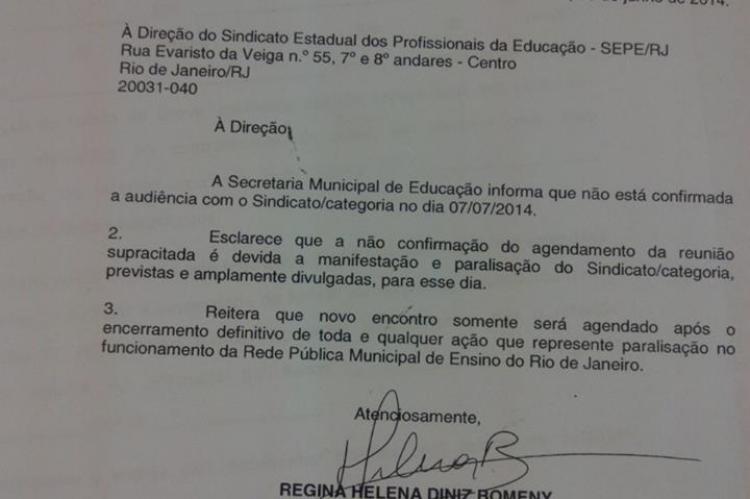 Ofício cancelando a audiência agendada para o dia 07/07. Imagem: Página do Facebook - Educação Municipal e Estadual do Rio em GREVE