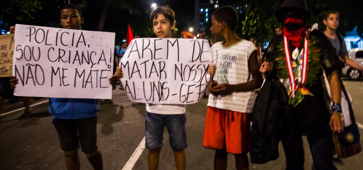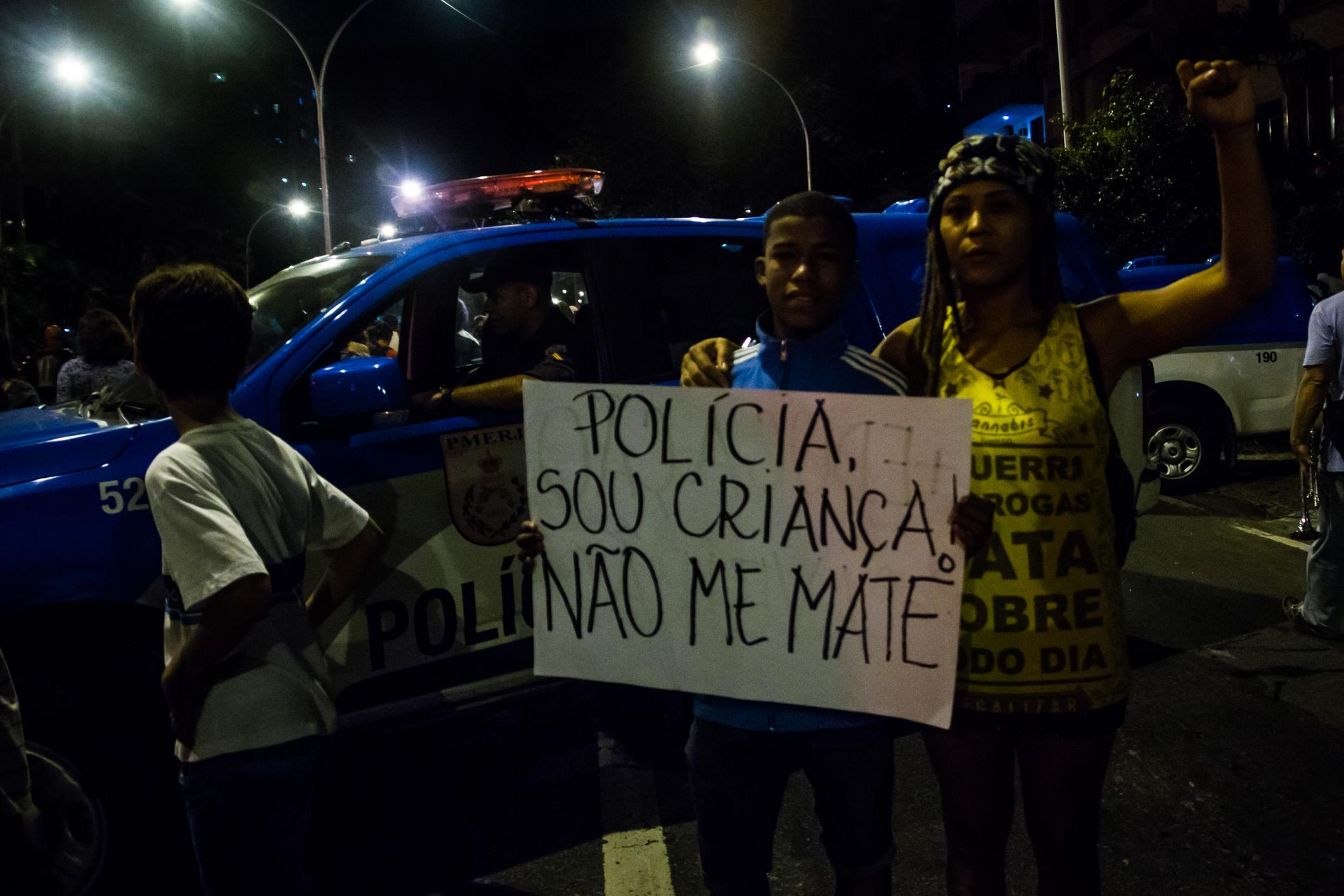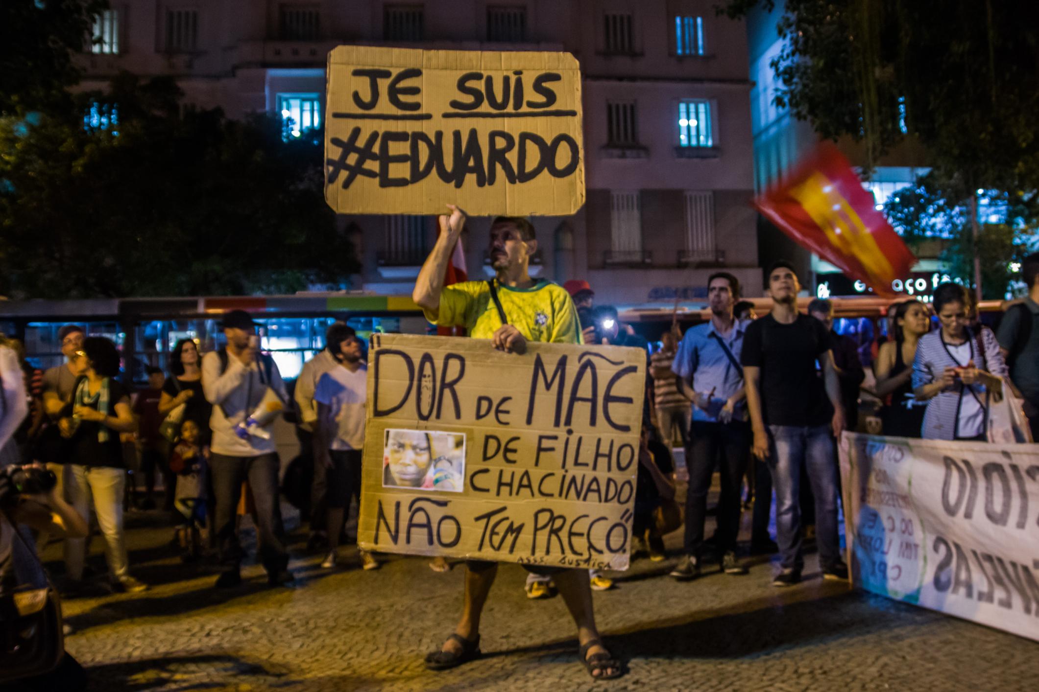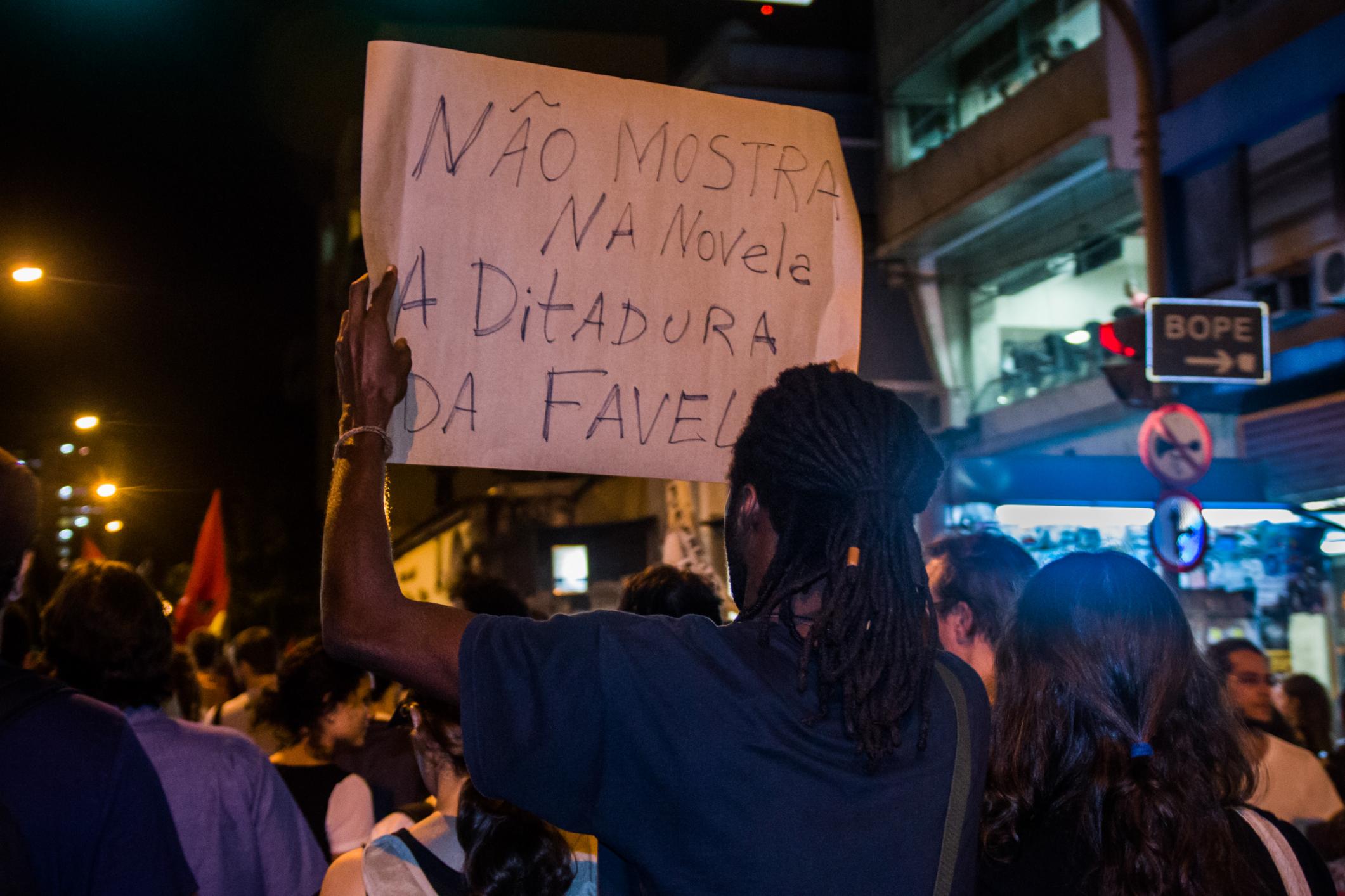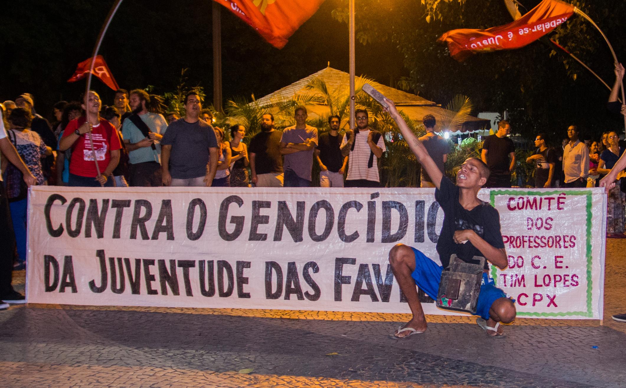 Cartazes e gritos denunciavam o genocídio da população negra e pobre sob a desculpa de pacificação e luta contra o tráfico. Lembravam também de Eduardo, criança de 10 anos assassinada no dia 02, com um tiro na nuca por um policial em frente a sua casa, em um beco no Complexo do Alemão.