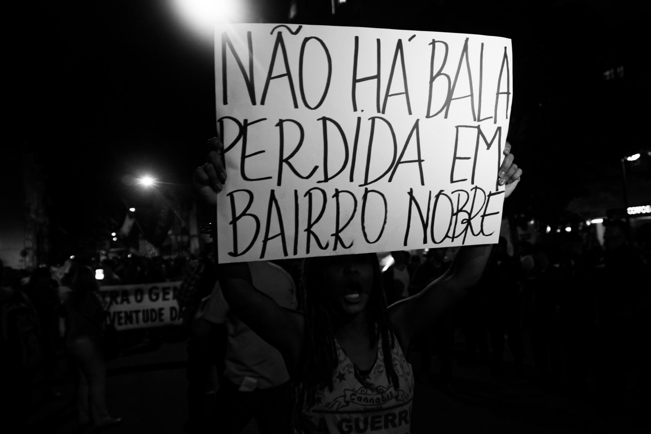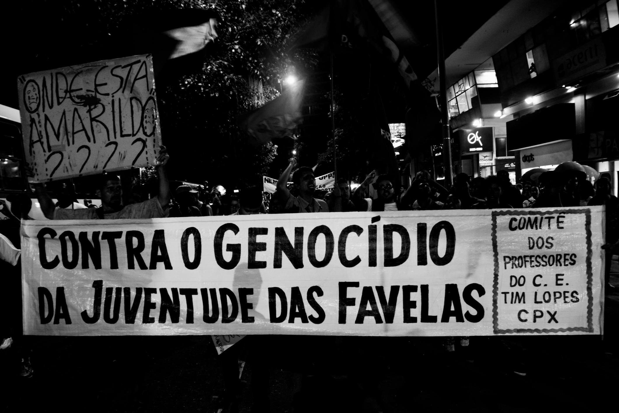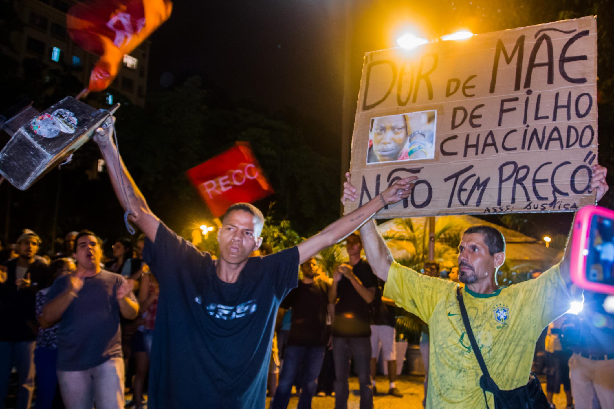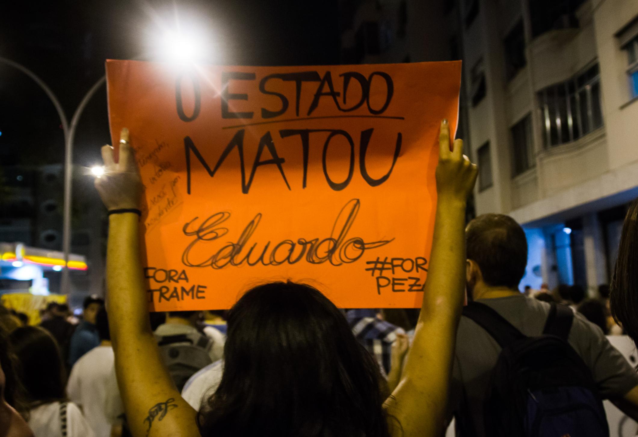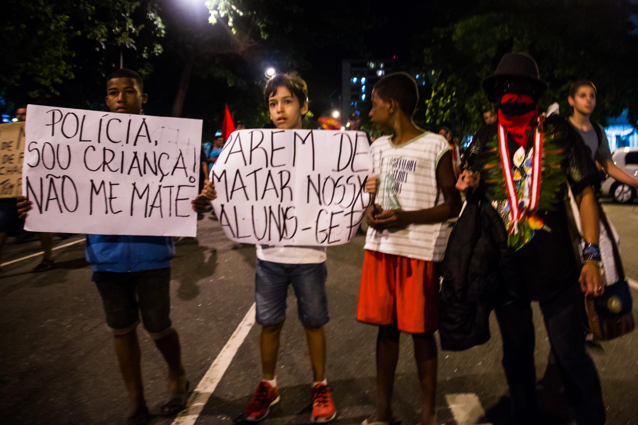 Cartazes e gritos denunciavam o genocídio da população negra e pobre sob a desculpa de pacificação e luta contra o tráfico. Lembravam também de Eduardo, criança de 10 anos assassinada no dia 02, com um tiro na nuca por um policial em frente a sua casa, em um beco no Complexo do Alemão.