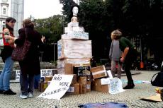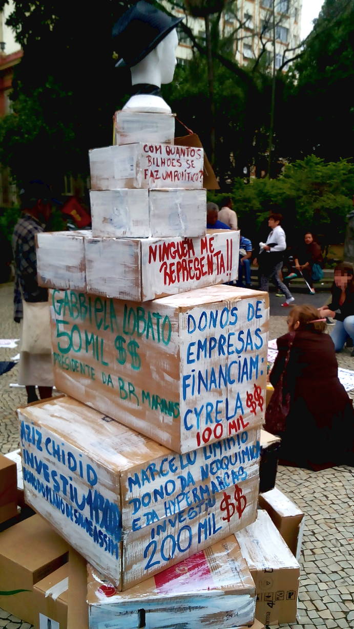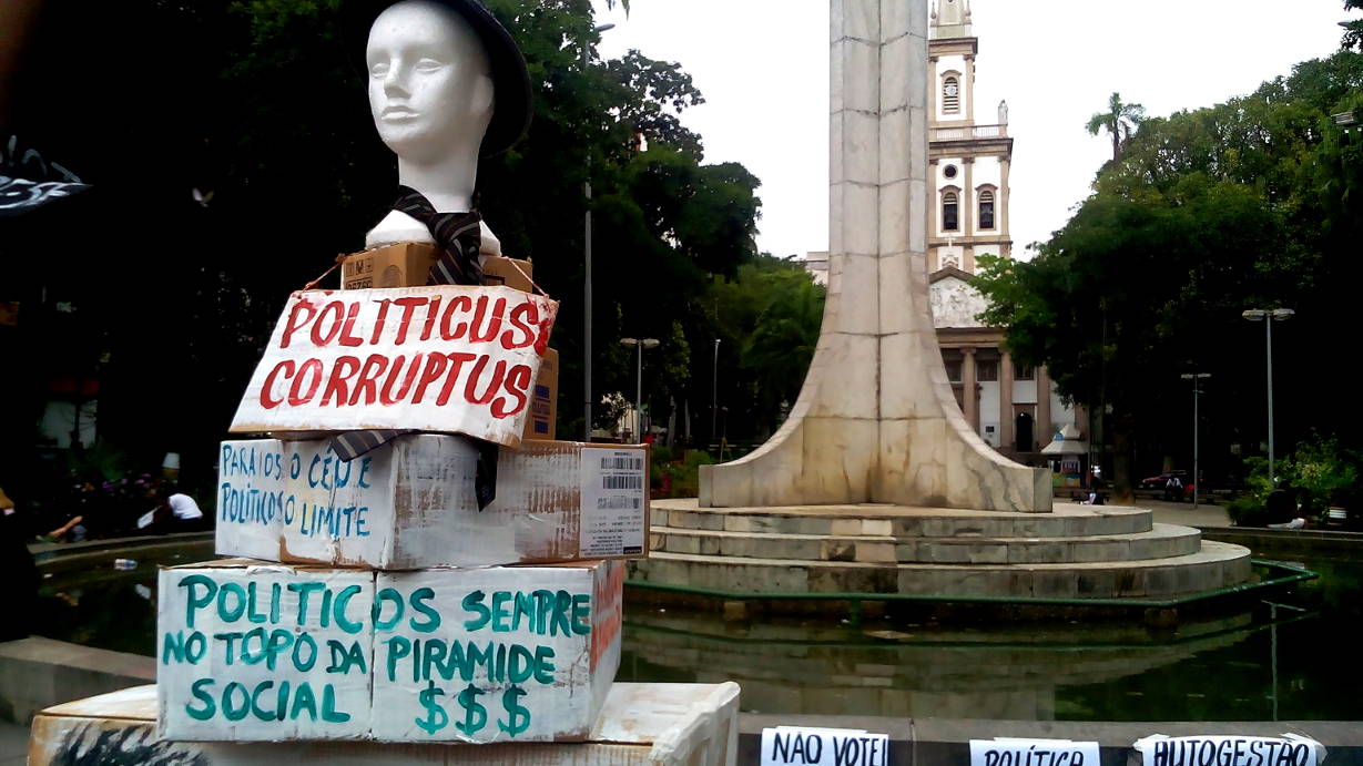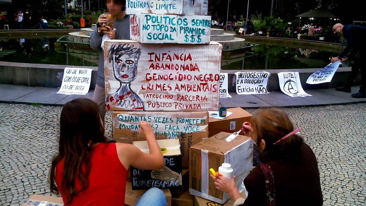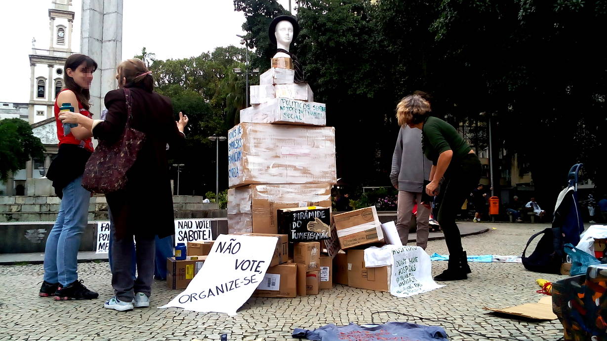 Manifestantes se reuniram na praça por volta das 13 horas e começaram a fazer cartazes e construir uma grande pirâmide criticando o processo eleitoral. A manifestação durou a tarde inteira, e diversas pessoas curiosas e interessadas pararam para observar e dialogar com os ativistas.