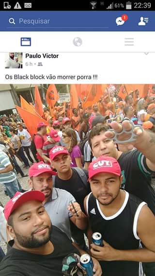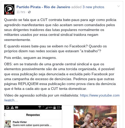 Tais seguranças fizeram postagens no facebook antes do ato sobre a contratação pela CUT e a intenção de agredir “Black Blocs”, como denunciado pela página do Partido Pirata. Em uma foto postada por um dos contratados, ele posa para uma foto com um soco inglês na mão e mais quatro homens com bonés da CUT e coloca a legenda “Os Black Block vão morrer porra !!!”, em outra, a mesma pessoa posta uma foto após a manifestação com a legenda: “O pau quebrou perdeu… Tava trabalhando po” onde admite que estava a trabalho na manifestação contratado para agredir Black Blocs.
