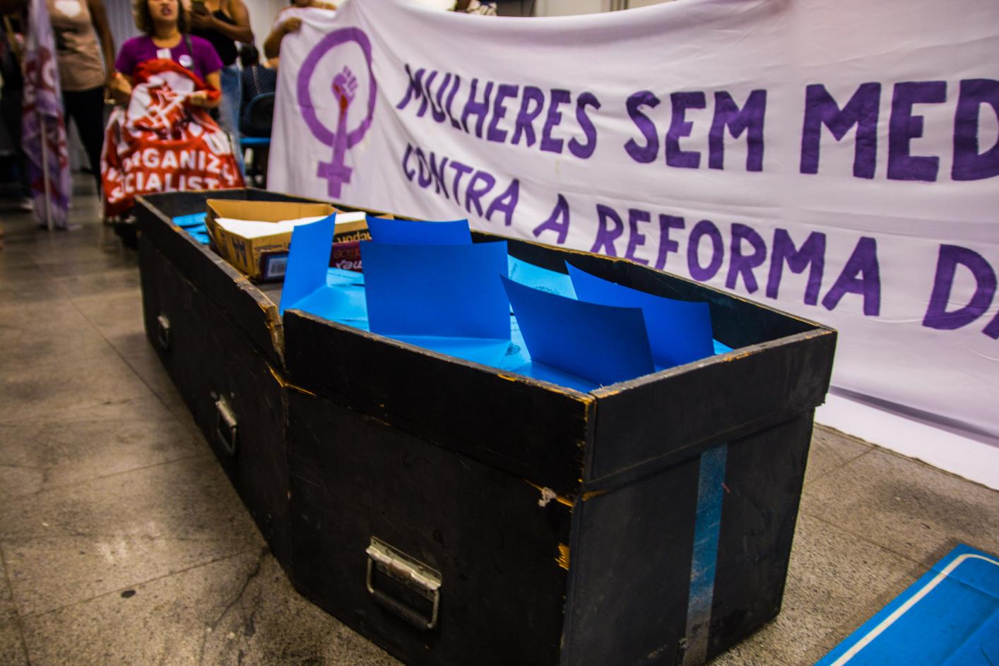 Em seguida as mulheres ocuparam a Previdência Social localizada na Av. Presidente Vargas e dialogaram com as pessoas que estavam para atendimento, convocando para o ato de mais tarde. Um caixão foi levado para representar a morte de aposentadoria caso a reforma venha ser aprovada. Pessoas que estavam esperando atendimento aproveitaram para reclamar do sistema e governo.