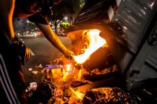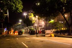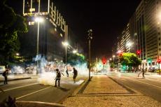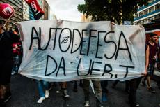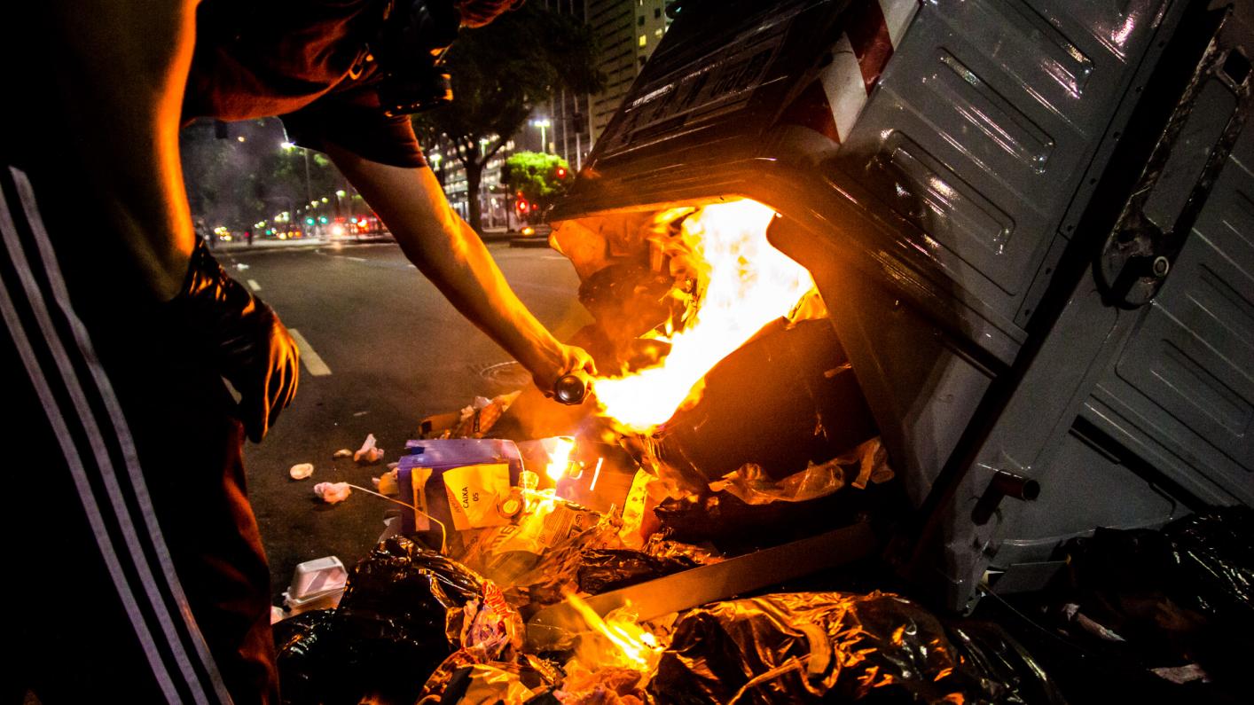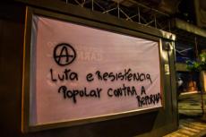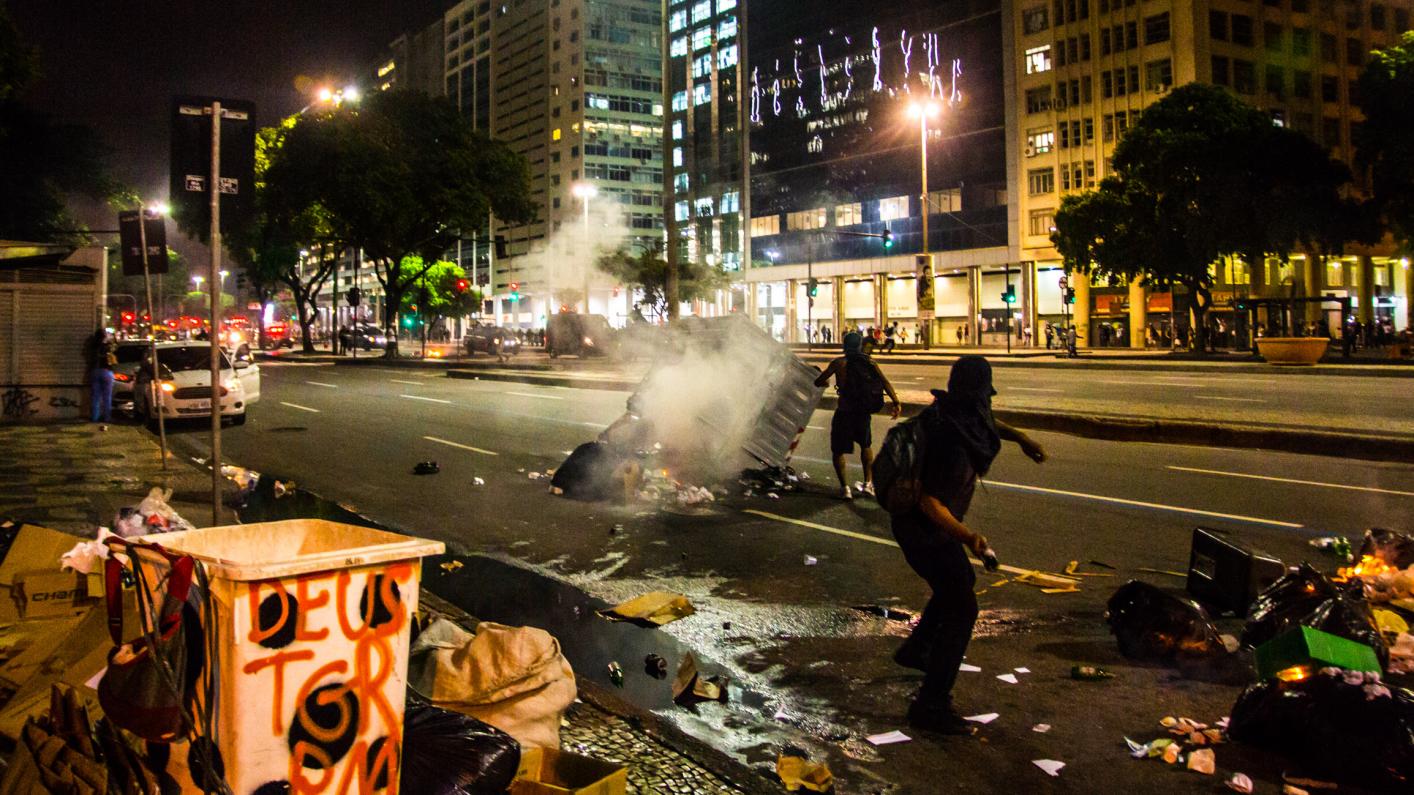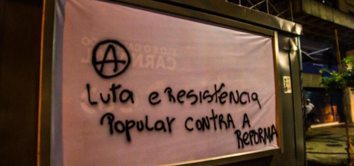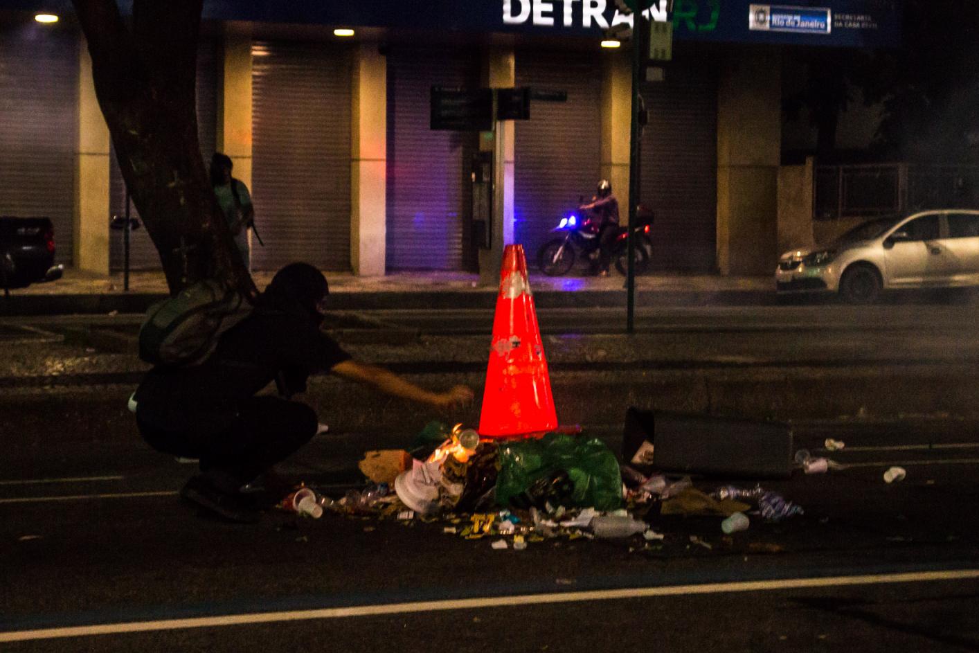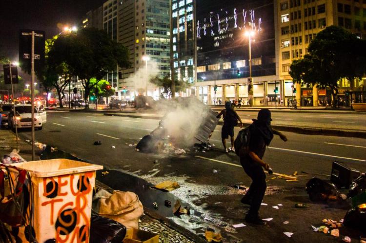 Enquanto a polícia empurrava o ato em direção a Cinelândia, manifestantes faziam barricadas queimando sacos de lixo e quebravam os bancos que havia pelo caminho. Os bancos são os principais beneficiados com a Reforma da Previdência e todos os pacotes anunciados pelos governos Federal e Estadual para pagamento de juros da dívida pública aos bancos, como o chamado “pacote de maldades do Pezão”, governador do estado do Rio, a privatização da CEDAE, entre outros.