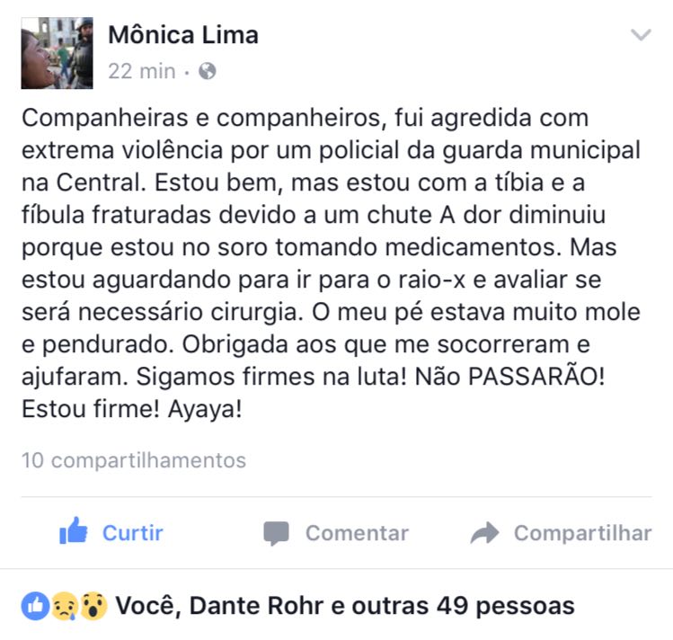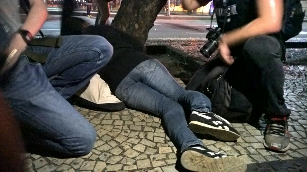 Diversas pessoas foram agredidas pelos policiais. Uma indígena teve sua perna fraturada em dois lugares por chutes de Guardas Municipais. Pessoas foram detidas também e encaminhadas para a 5a e 9a Dps. Na Cinelândia bombas de gás foram atiradas dentro dos bares da praça, inclusive o famoso bar do Amarelinho. Bombas também foram lançadas dentro da Universidade Federal do Rio de Janeiro – UFRJ, no Largo de São Francisco.