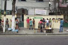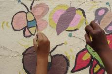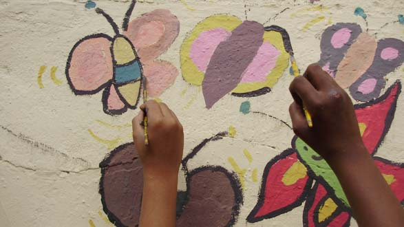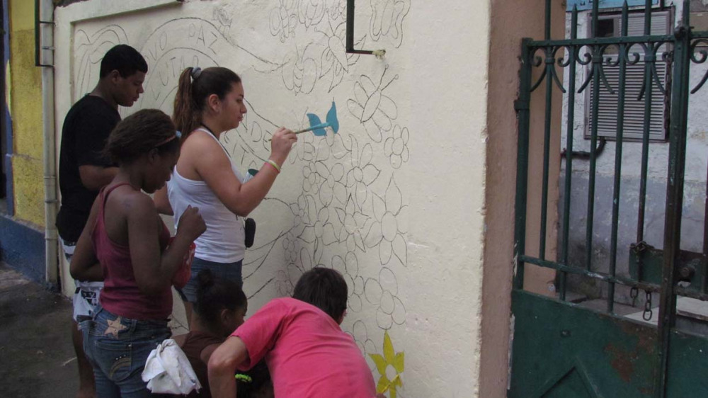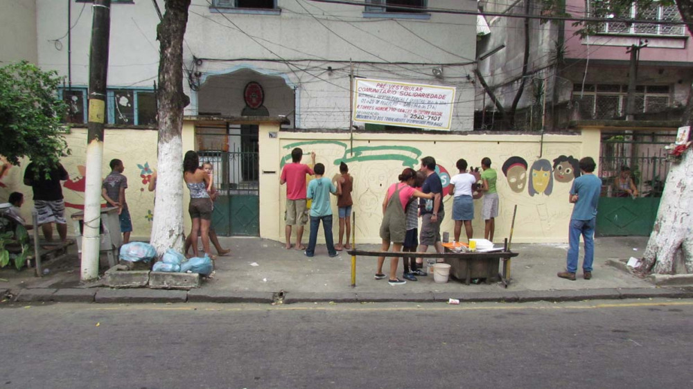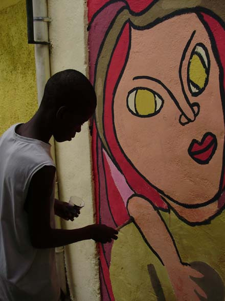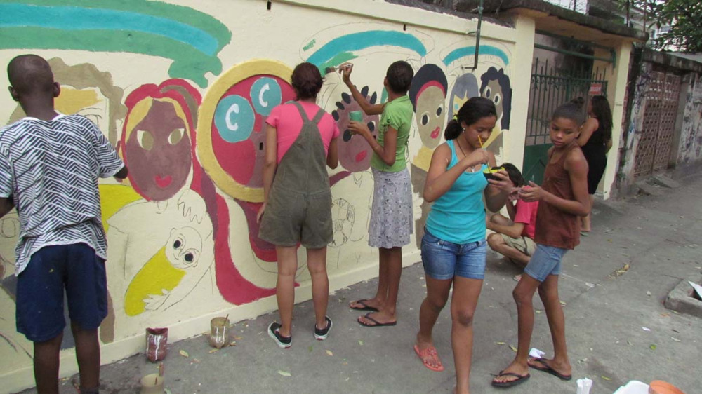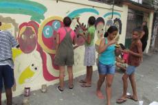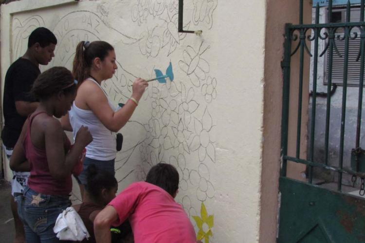 Nos dias 21 e 28 de abril, foi realizada uma atividade de muralismo em conjunto com os jovens que participam da oficina de artes do Grupo Luz do Sol. Antes da pintura, foi feita uma conversa sobre o muralismo e sua proposta. A partir de desenhos, frases e idéias das crianças, sobre o que elas achavam que fosse importante estar presente no desenho, foi elaborado uma proposta de composição para o muro. Durante a pintura, algumas cores e traços mudavam, as crianças davam opiniões e sugestões.