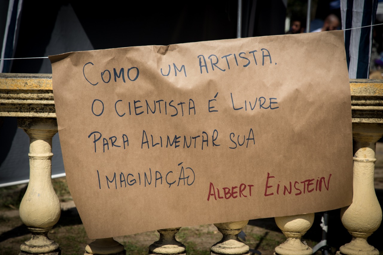 O que podemos destacar já de início é algo que, apenas ao olhar, ficava bem evidente: o predomínio de pessoas brancas e de classe média presentes no evento. Algo que, devido ao caráter quase aristocrático que a ciência possui, já deveríamos esperar. No entanto, ao andarmos pela Quinta da Boa Vista (pois o Museu Nacional fica numa parte mais alta e isolada) o quadro mudava drasticamente, era possível ver famílias que de fato representavam a população brasileira. Famílias brancas acostumadas com ciência em seus cotidianos davam lugar às pardas e negras, àquelas cujas participações nos diversos campos científicos foram-lhes negadas, àquelas cujo papel relegado é ser alertada sobre “a grave crise da ciência, tecnologia, inovação e educação no Brasil” e lutar por mais investimentos na ciência, pois aparentemente sua participação na construção dela não é necessária. Com isto, um evento com potencial enorme dada a localização e condições climáticas (domingo de sol com temperatura agradável e entornos do Museu cheio), se contrapôs a ausência de divulgação na própria Quinta da Boa Vista, o que materializou, como consequência, um evento que mais parecia um encontro de amigos e uma egotrip coletiva do que uma manifestação em defesa da ciência.