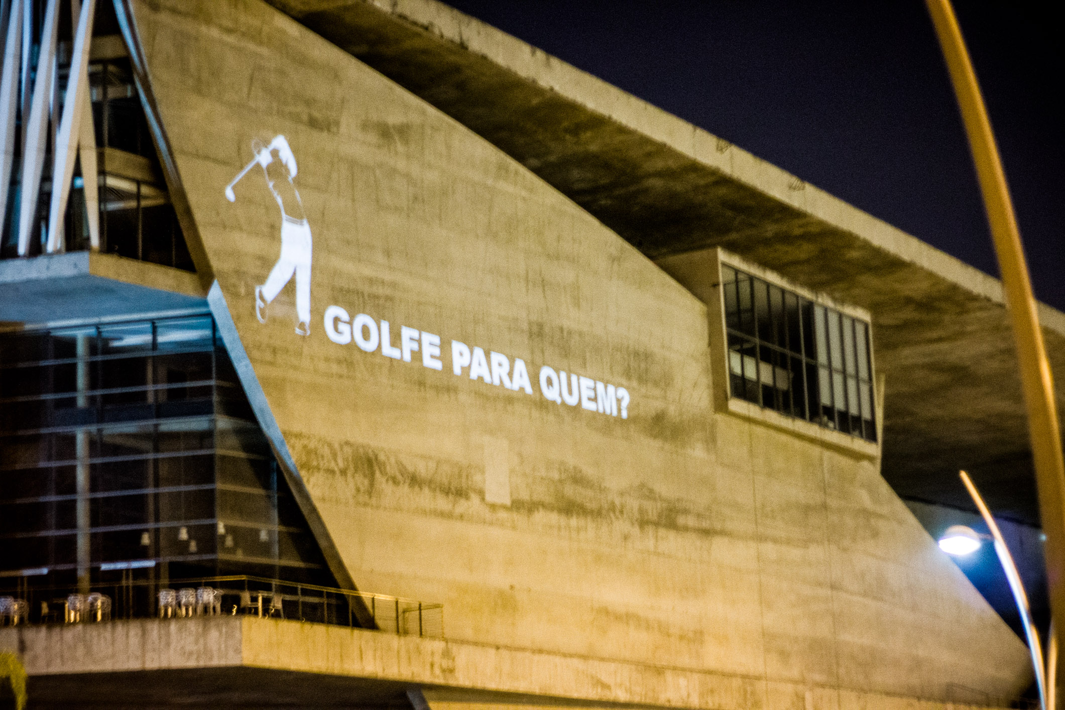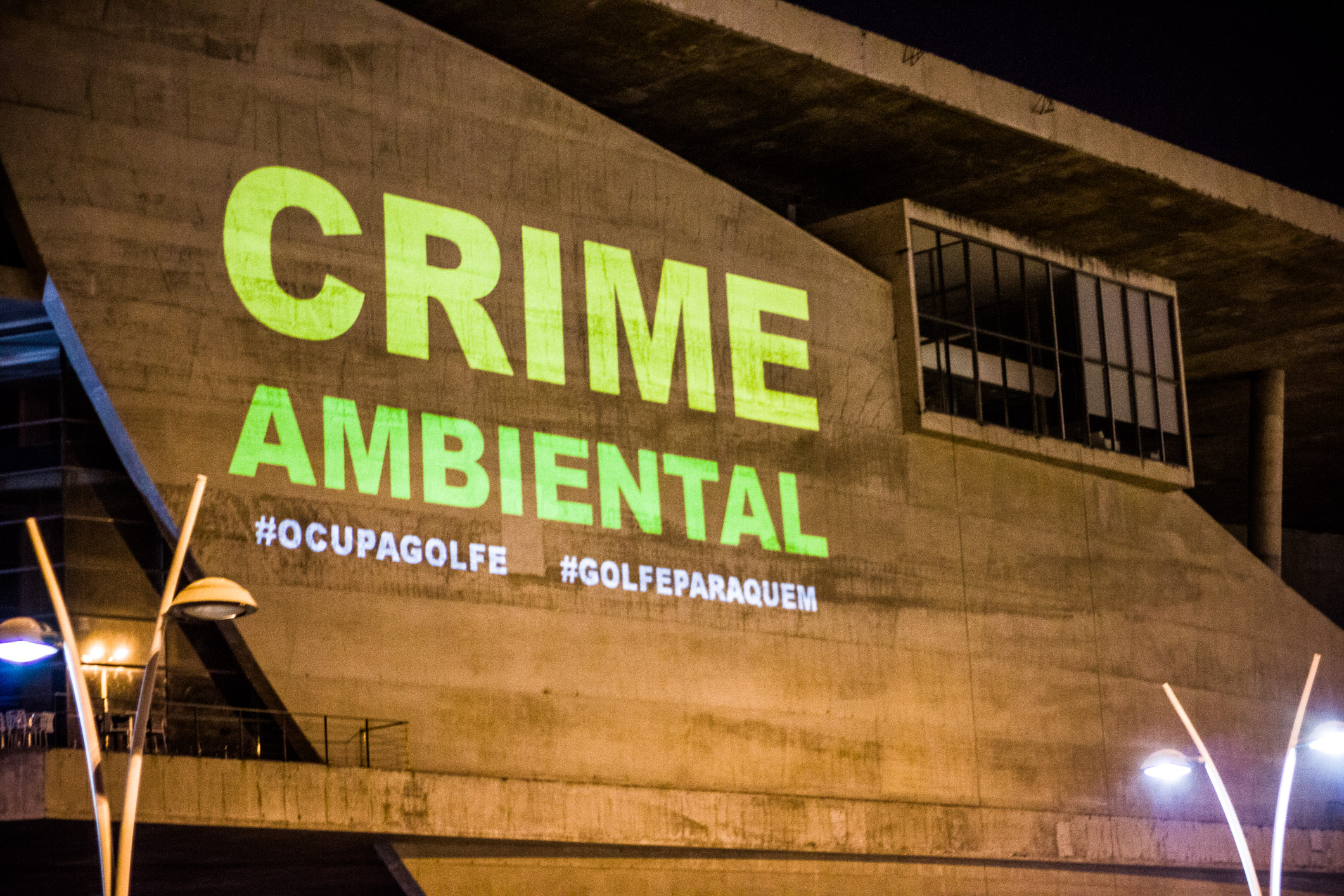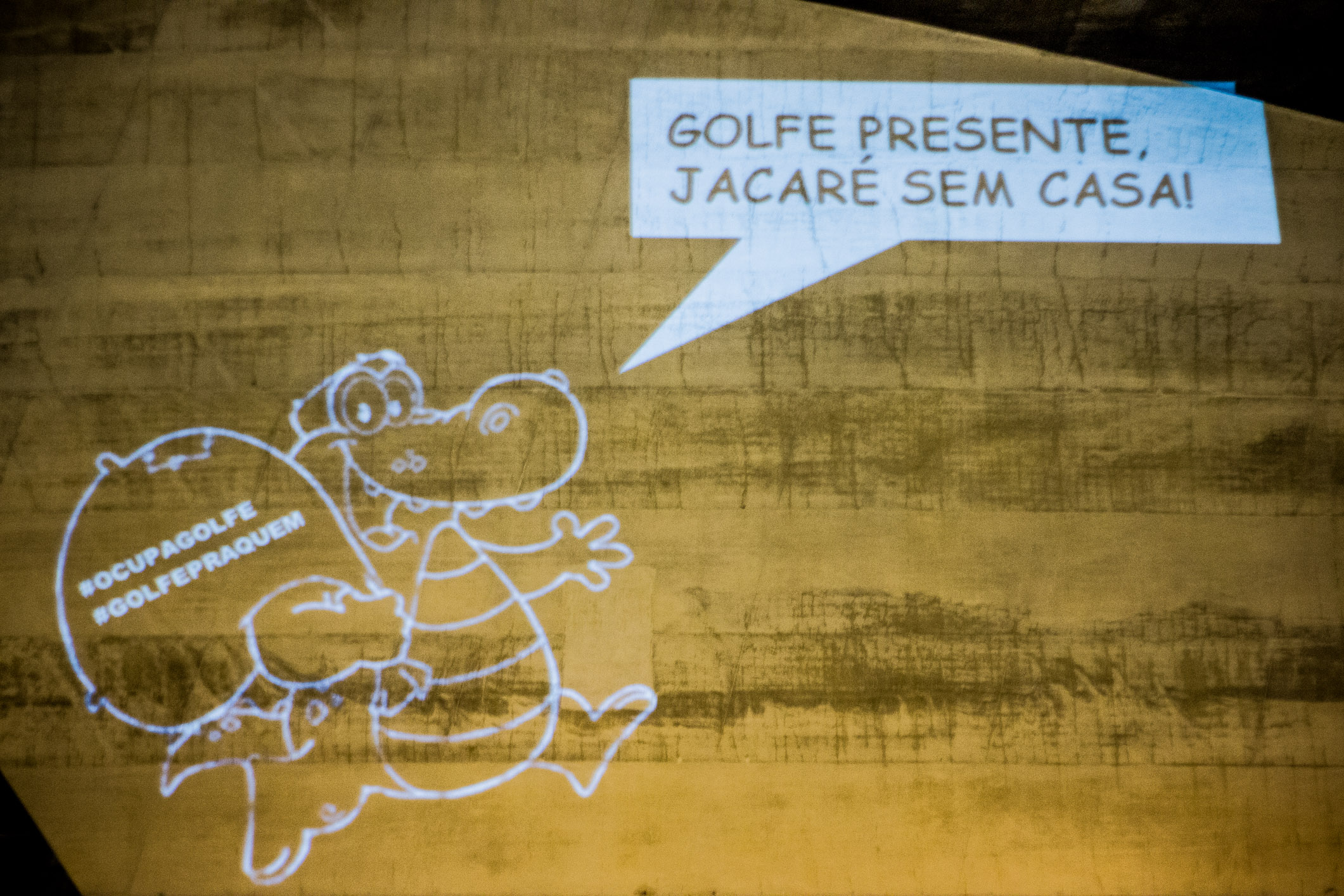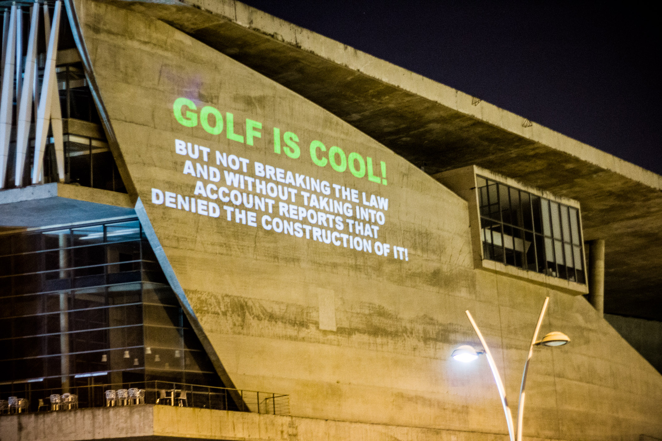 O Coletivo Projetação também esteve presente e utilizou as paredes do Cidade das Artes para projetar imagens e textos em repúdio ao impacto ambiental e às irregularidades das obras do Parque Olímpico de Golfe na Reserva Marapendi.