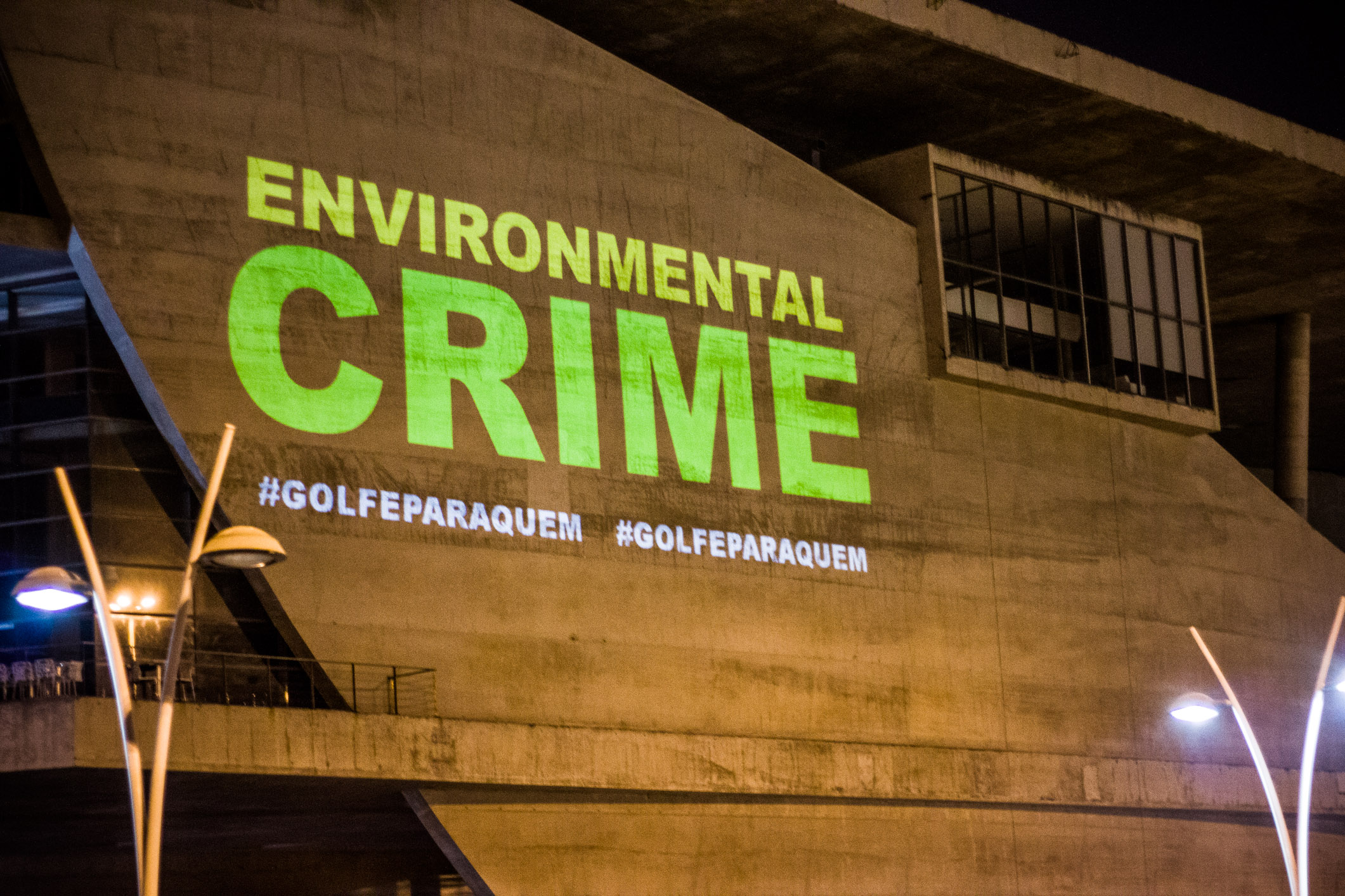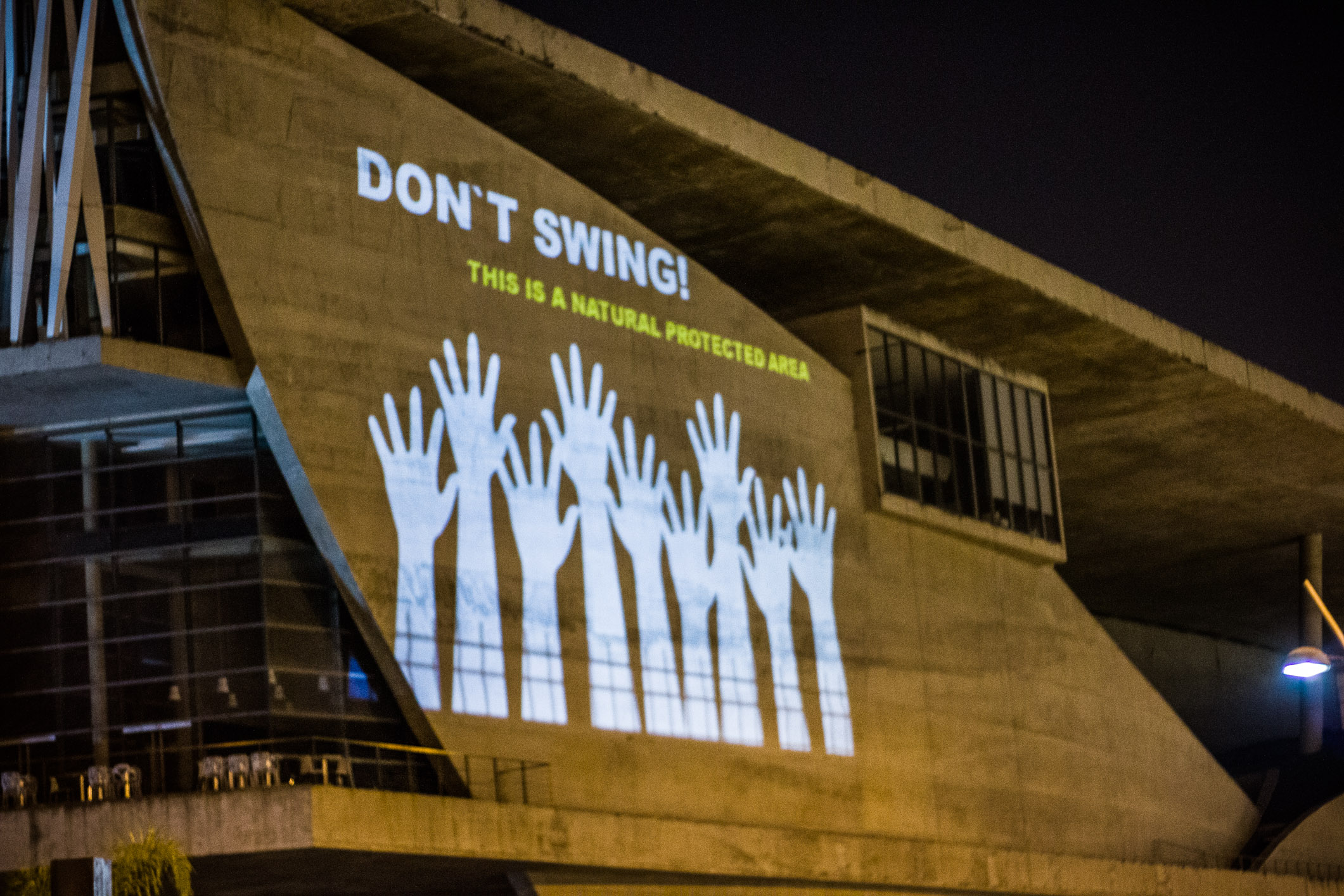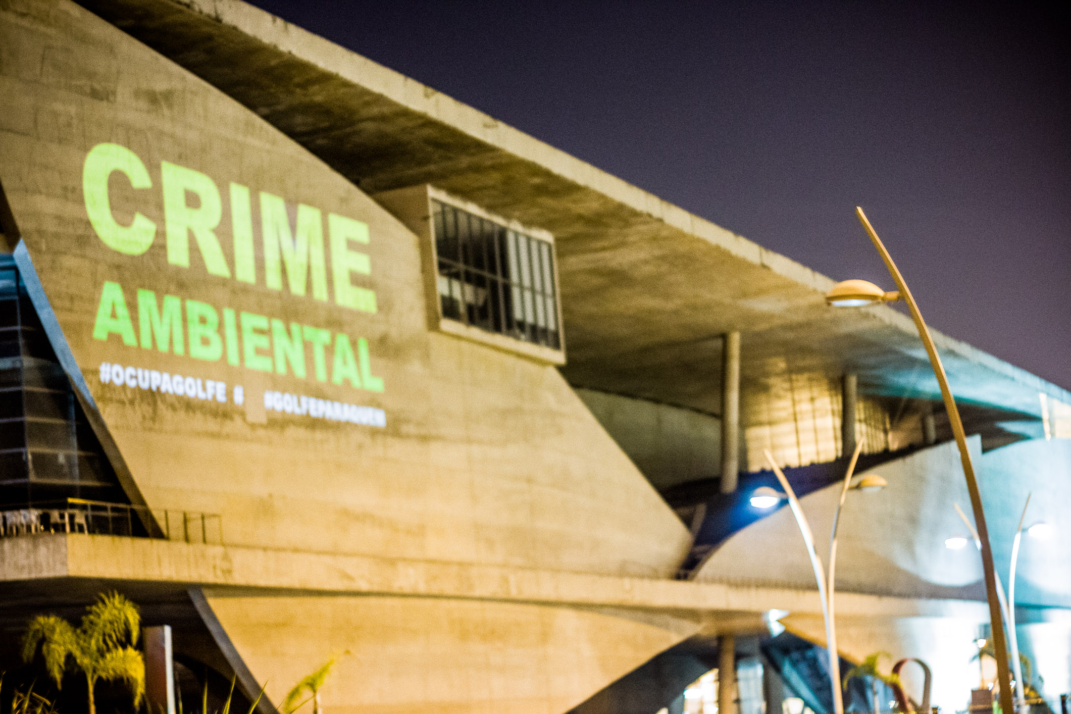 O Coletivo Projetação também esteve presente e utilizou as paredes do Cidade das Artes para projetar imagens e textos em repúdio ao impacto ambiental e às irregularidades das obras do Parque Olímpico de Golfe na Reserva Marapendi.
