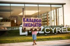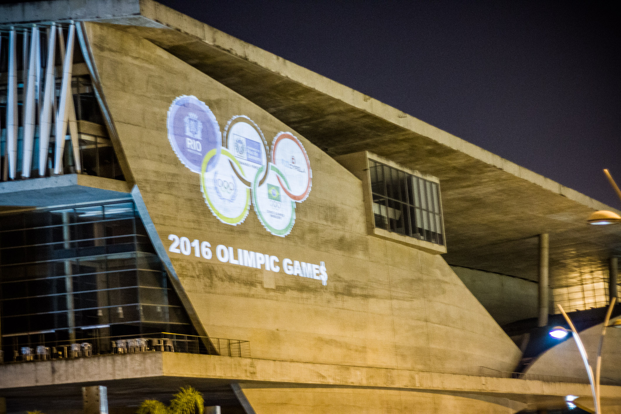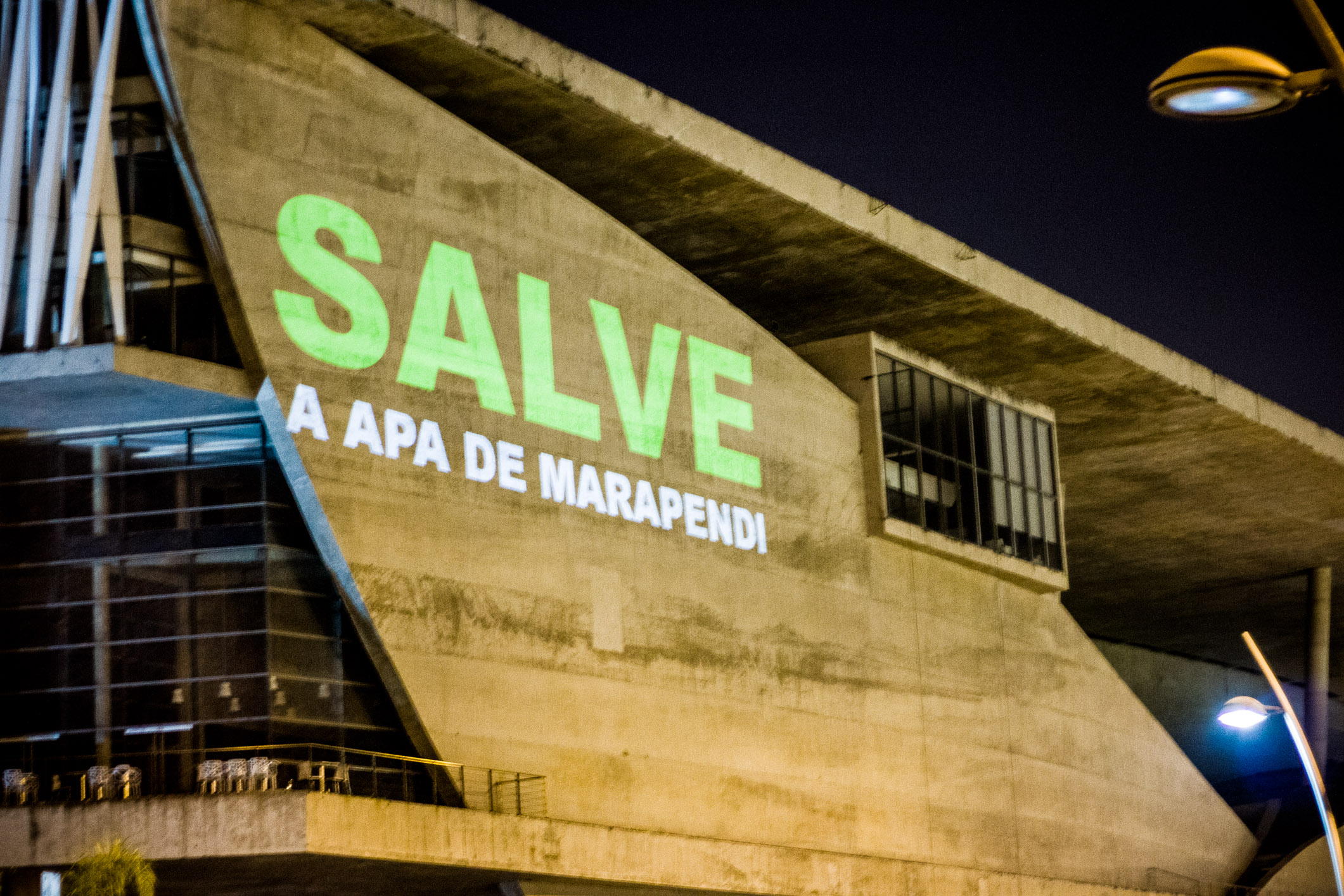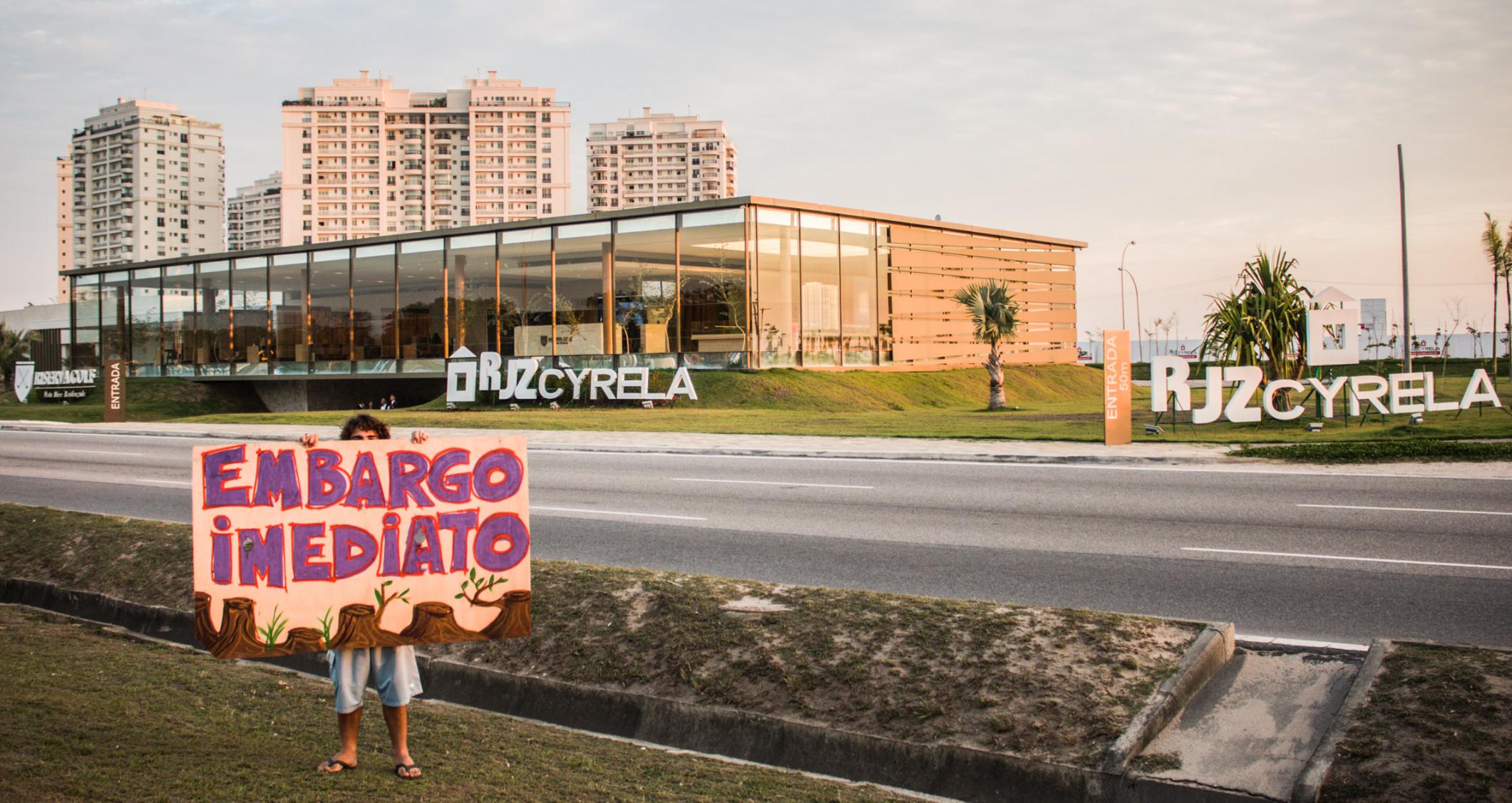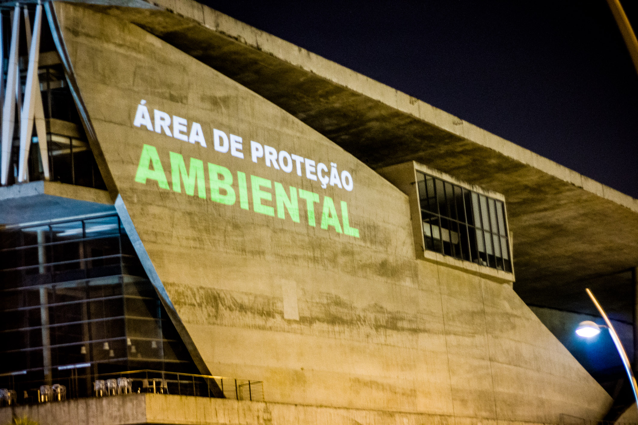 O Coletivo Projetação também esteve presente e utilizou as paredes do Cidade das Artes para projetar imagens e textos em repúdio ao impacto ambiental e às irregularidades das obras do Parque Olímpico de Golfe na Reserva Marapendi.